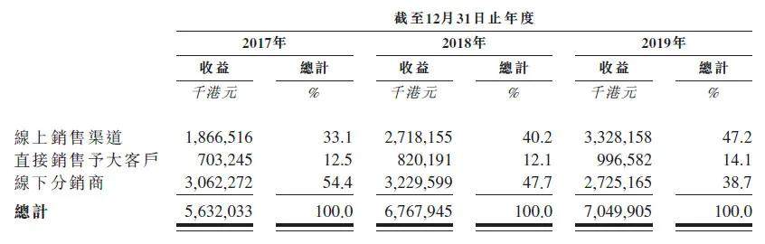 如今,线上销售依然是为蓝月亮贡献最多的渠道。招股书显示,蓝月亮2019年线上销售收入33.28亿港元,收入贡献度占比达47.2%。
