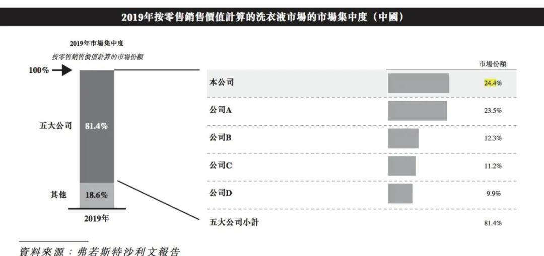 弗若斯特沙利文报告显示,2019年,蓝月亮洗衣液的市场占比为24.4%,与第二位仅有0.9%的差距,二者势均力敌。