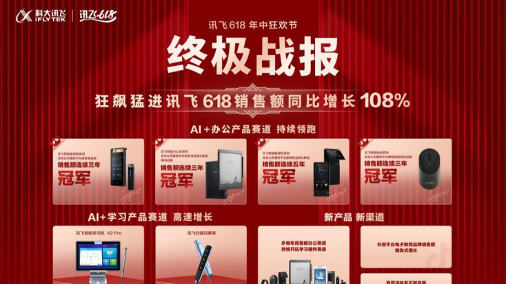 科大讯飞正式发布今年618战报,凭借AI硬件狂飙猛进,销售额同比增长108%。618作为全年规模最大、促销力度最强的两大电商狂欢节之一,既是AI智能硬件产品硬实力的“竞技场”,也是AI消费者行业未来发展趋势的“晴雨表”。作为国内AI领军企业,在今年618大促中科大讯飞战绩喜人。