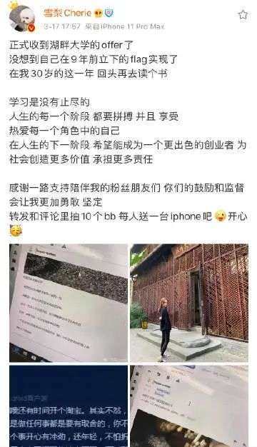 2020年3月,已经30岁的雪梨收到了湖畔大学的offer,她激动地在微博抽了10台Iphone。声称“回头再去读个书”很开心。