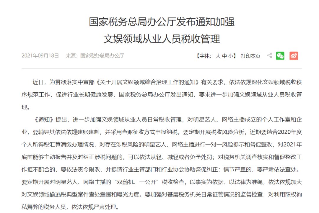 事情起源于今年9月18日,国家税务总局发布《关于开展文娱领域综合治理工作的通知》,通知表示要对存在涉税风险的明星艺人、网络主播进行一对一风险提示和督促整改。