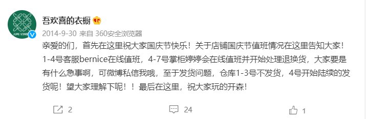 微博外链的导入,成为这一年“钱夫人店”大部分流量的来源。雪梨能让微博成为淘宝店铺的流量入口,与2013年阿里巴巴入股微博有关。