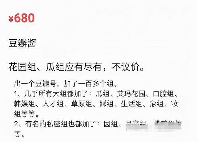 于是,咸鱼上衍生了一门豆瓣账号买卖的生意,买卖暗号“豆瓣酱”。据了解,一个加入花园组、瓜组、象组等几乎所有大型豆瓣小组的账号,可以卖到680元。这些账号基本都被粉丝买走,用来给明星刷分。如果现在到闲鱼上已经搜不到“豆瓣酱”了,但能搜出个“豆瓣小耗”。
