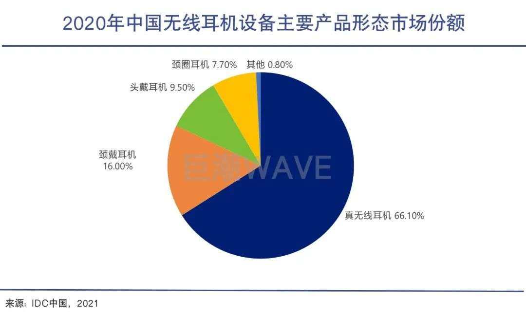 苹果的AirPods的发布,将无线蓝牙耳机市场推向了一个全新的高潮,也让TWS耳机成为了无线蓝牙耳机市场的主流。据IDC统计,2020年中国市场的TWS耳机在无线耳机设备中的占比已经达到66%。