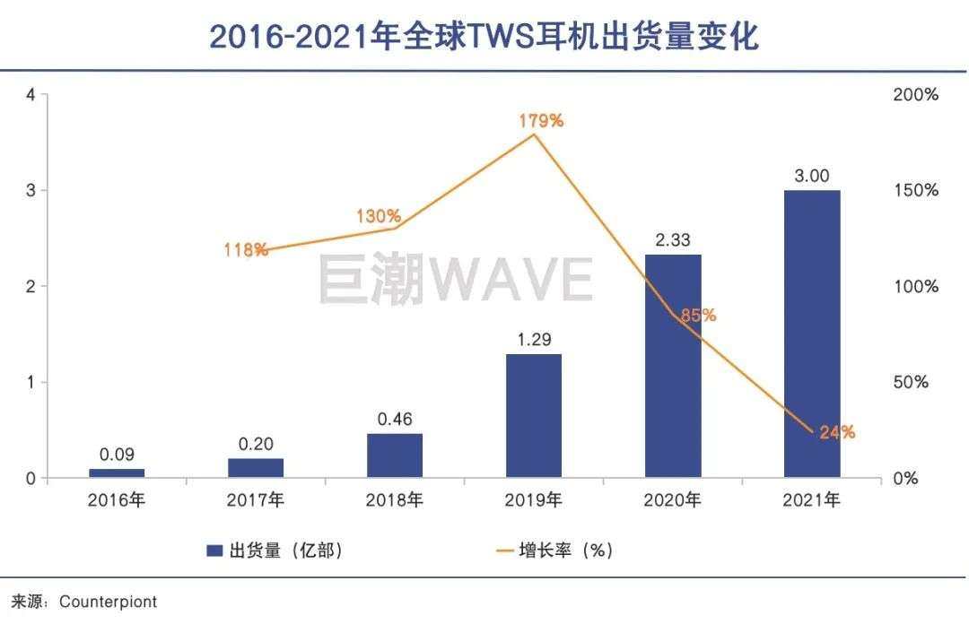 全球市场中的TWS耳机,销量同样实现了迅速的爆发。根据市场机构Counterpoint Research的数据,从2016年到2020年,全球TWS耳机出货量五年暴增25倍,2020年全球出货量高达3亿台。