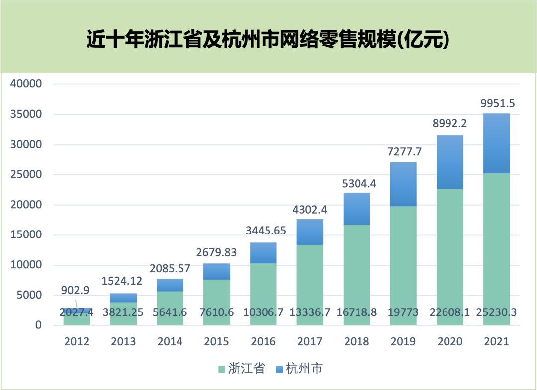过去十年间,杭州市网络零售规模从2012年的902.9亿元增长至2021年9951.5亿元,实现了10倍以上的跨越式增长,成为国内电商产业发展最快的城市。政策利好下,杭州市直播电商产业进入快速发展期,2021年,直播电商交易额占比已达到电商总额的68.1%,领跑全国。