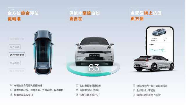极氪自研检测工具,创新推出360余项智能电动汽车专业检测标准,并依托大数据精准算法模型,自动生成可公开的三电综合状态评分、历史车况等级、整车综合车况评分。结合检测评级和市场行情,极氪车辆价值管理系统进行综合分析,给出合理的定价。