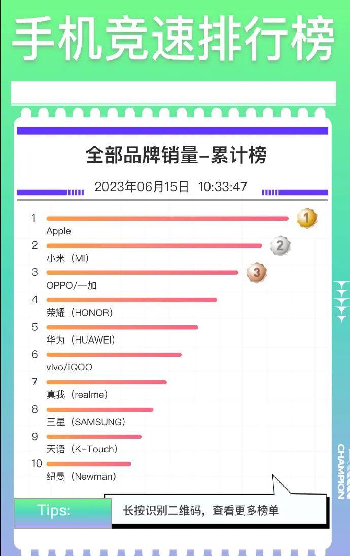 6月19日,京东方面给出了从5月23日618拉开帷幕、到6月18日大促落幕期间的手机竞速排行榜,展示了各品牌销量在此期间的累计数据。