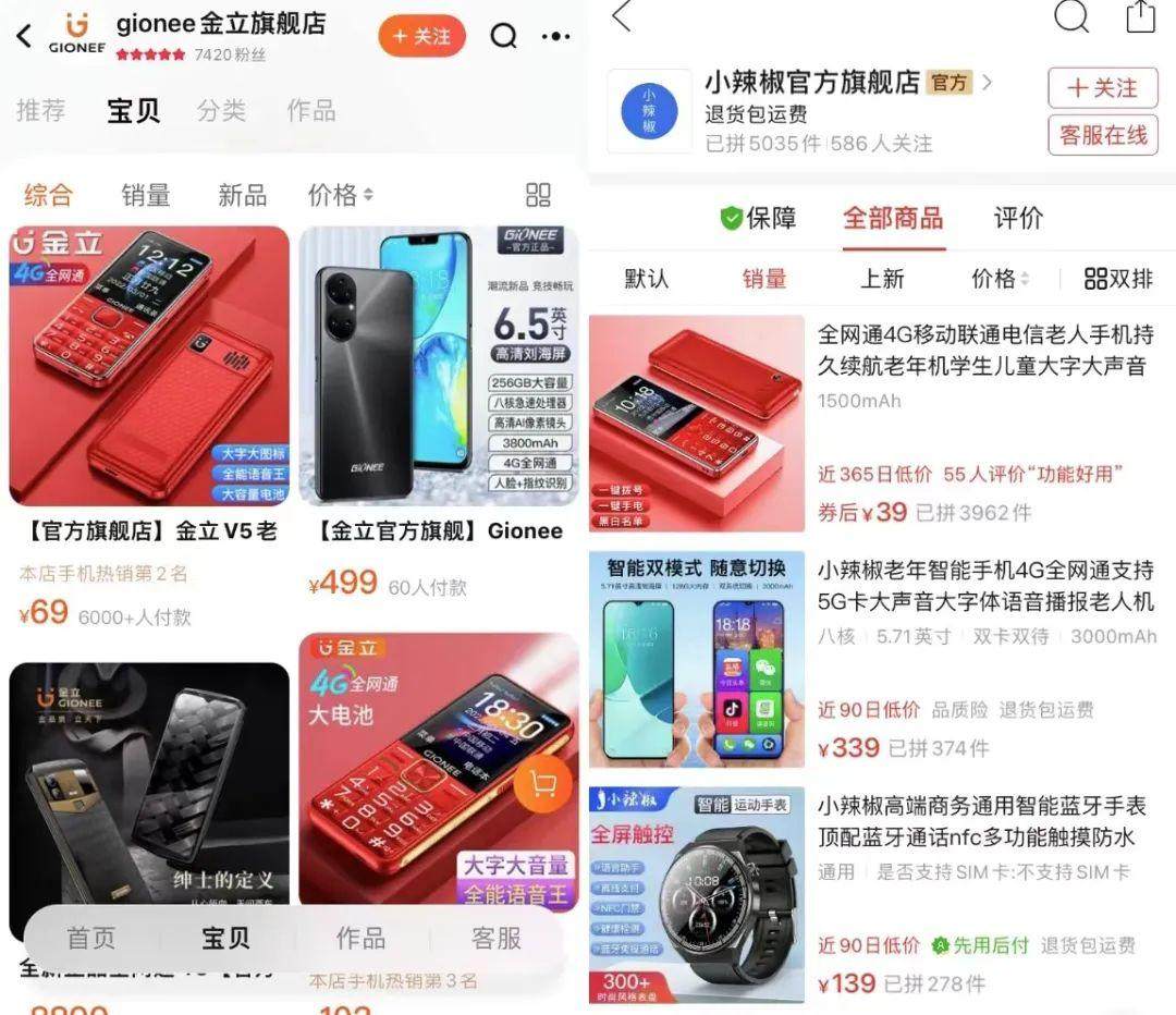 金立在淘宝上开了一家名为“GIONEE金立旗舰店”,店铺中上架了十多个商品,大部分都是带实体按键的功能机,少部分是智能机。可以明显看出来,如今的金立已经将重心放到了以老人机为主的功能手机身上,产品和曾经的“金立语音王”相差无几。