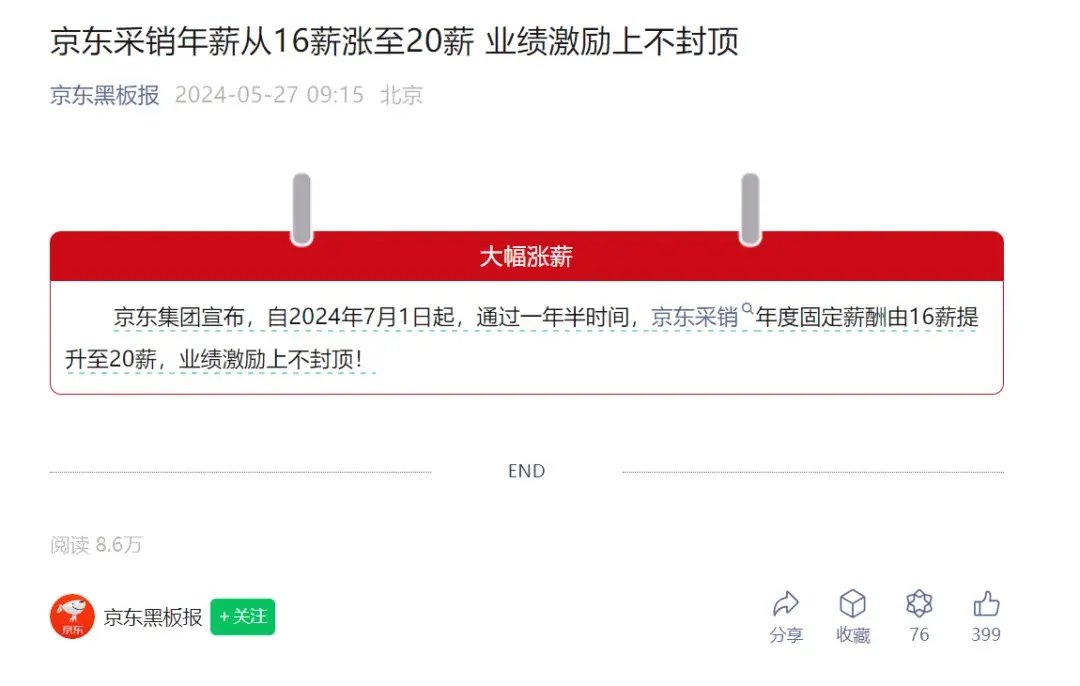 再到近日,京东又宣布自2024年7月1日起,通过一年半时间,京东采销年度固定薪酬由16薪提升至20薪,业绩激励上不封顶。