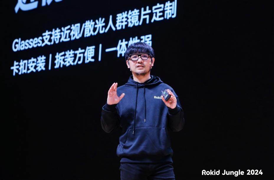 2024年11月18日 ,Rokid Jungle 2024 合作伙伴暨新品发布会在杭州举行。此次发布会 Rokid 推出一款与BOLON眼镜联名的新一代 AI + AR 眼镜—— Rokid Glasses,同时也向行业展示其丰富的内容生态。