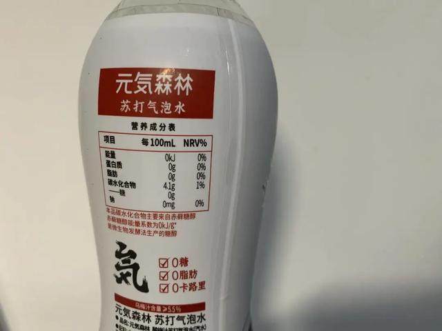 元气森林酸梅汁苏打气泡水营养成分表显示,能量、蛋白质、脂肪、糖均为0,但碳水化合物为4.1g/每100ml,且写明碳水化合物主要来自赤藓糖醇,为微生物发酵法生产的糖醇。