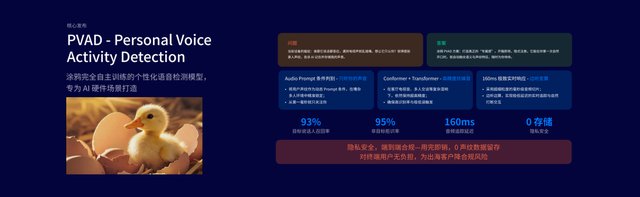 除了Hey Tuya 新版本首发,涂鸦智能还现场发布了专为AI硬件落地场景打造的自训练Personal Voice Activity Detection(PVAD)模型,重磅升级的Physical Al Foundation V2.8、WukongAl3.0、T-RTC实时通信网络、Physical Action Model(PAM)模型、OmniMem V2.0长记忆系统等全栈式的开发者“铲子”;涂鸦开发者还可现场体验打通数字世界与物理世界的AI工作台TuyaClaw、硬件原生的AI Agent框架DuckyClaw、支持通过自然语言构建生产级应用的Vibe Coding、能力升级的Tuya AI开发平台等创新AI引擎。通过这些举措,涂鸦智能做到了真正的全面降低AI开发门槛,赋能AI应用创新,让AI惠及更多消费者。